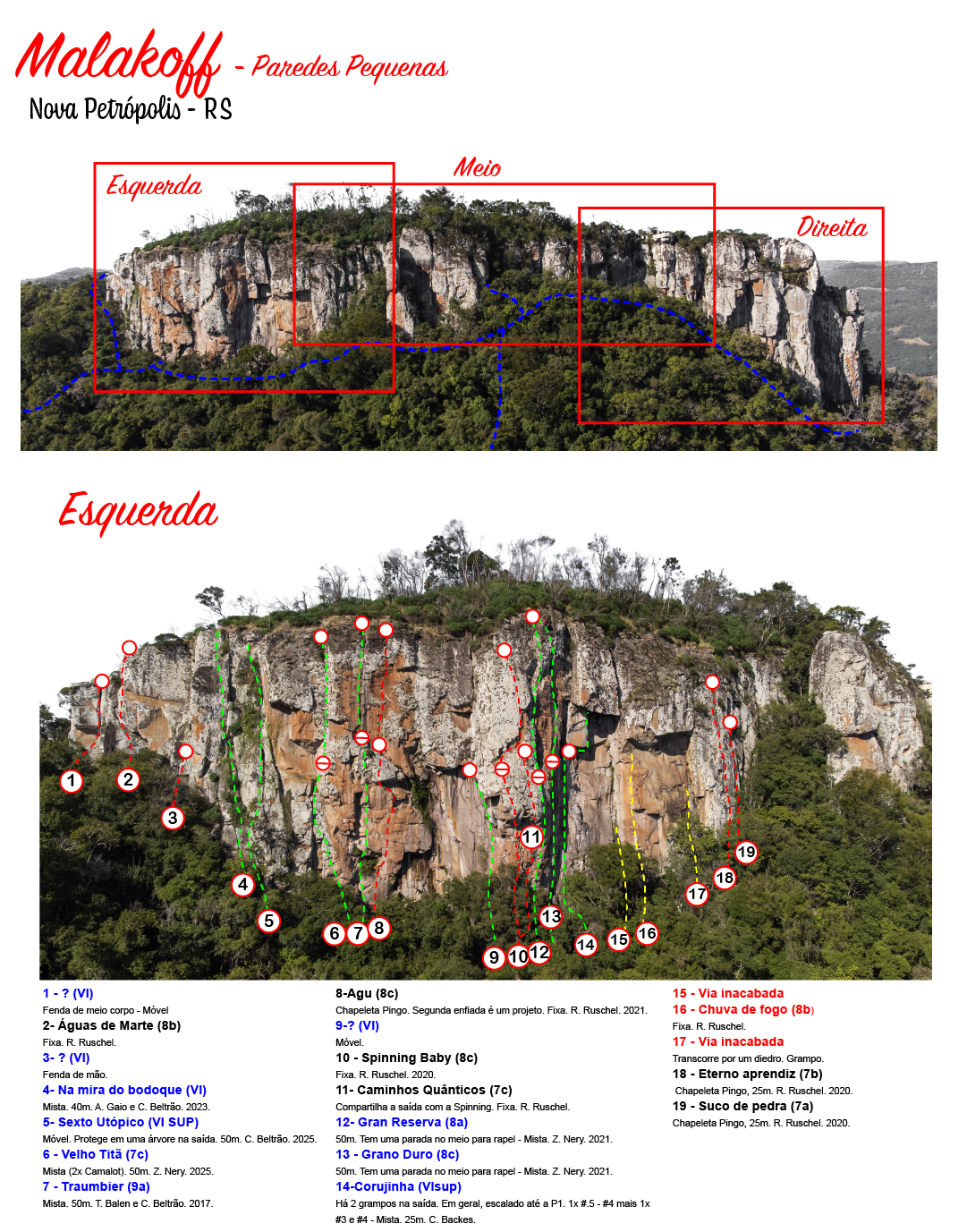 | Caminho do Meio (6º/A2) | Parede Grande | Glauco Silva e Ricardo Canguçu | 2002 | 1ª Enfiada Assim como a maioria das vias no malakov, começa dominando o grande plato principal da formação. São aproximadamente 10 metros em livre e protegido em uma chapeleta seguindo com alguns móveis. 2ª Enfiada É a mais extensa das enfiadas, com aproximadamente 40m de um artificial A2. São boas sequências de fendas e passadas em cliffs. O início da artificial com 4 passadas com clifs em buraco, atravessando uma rampa lisa sem agarras ate atingir uma fenda na esquerda. Segue então por esta sequencia clara de fendas, intercaladas por alguns buracos de cliff quando as possibilidades de proteção somem. Esta enfiada está bem definida e a linha da via tambem é bem clara. 3ª Enfiada Também uma linha bem definida com boas fendas e opções para proteção, com cerca de 25m de A2. Uma pequena travessia no meio da enfiada leva até a rampa da segunda parada. 4ª Enfiada (ultima) Esta enfiada ainda pode continuar por mais alguns metros no futuro, mas no momento esta com 20 metros aproximadamente. O “final” da via é uma sequencia de lances ate atingir as chapeletas, são duas, separadas por 4 metros uma da outra. Observação: O rapel é feito na última chapeleta (fixe) com uma fita. |